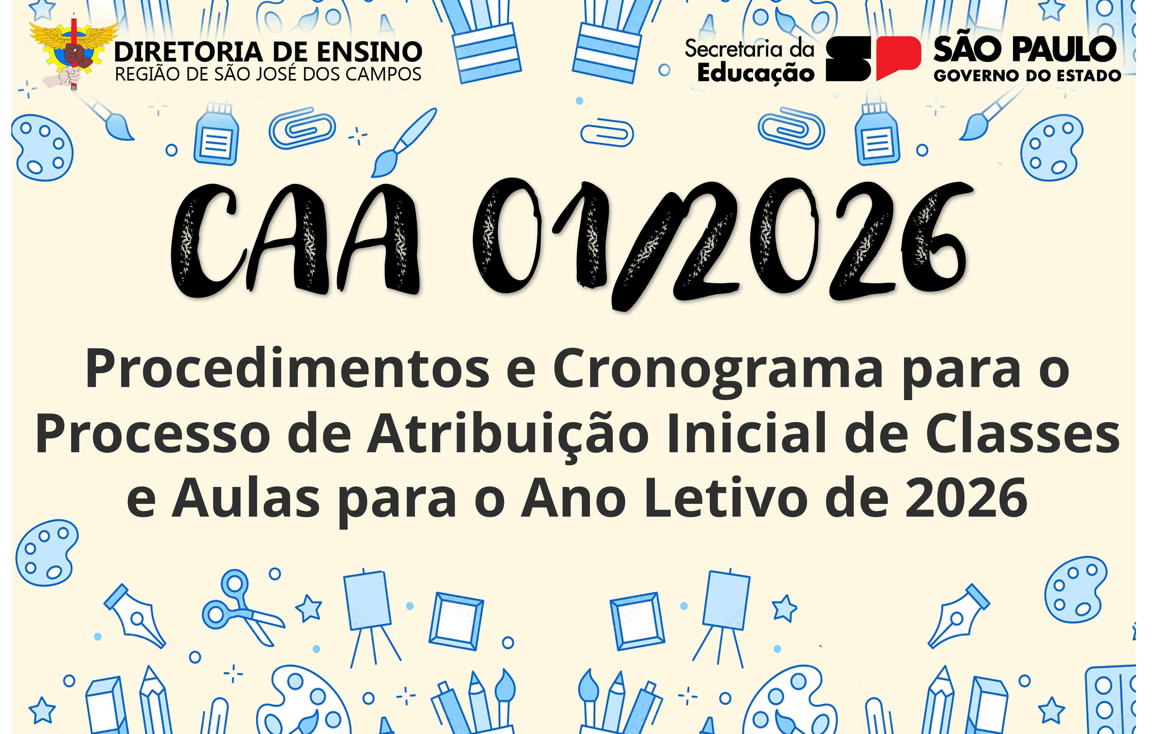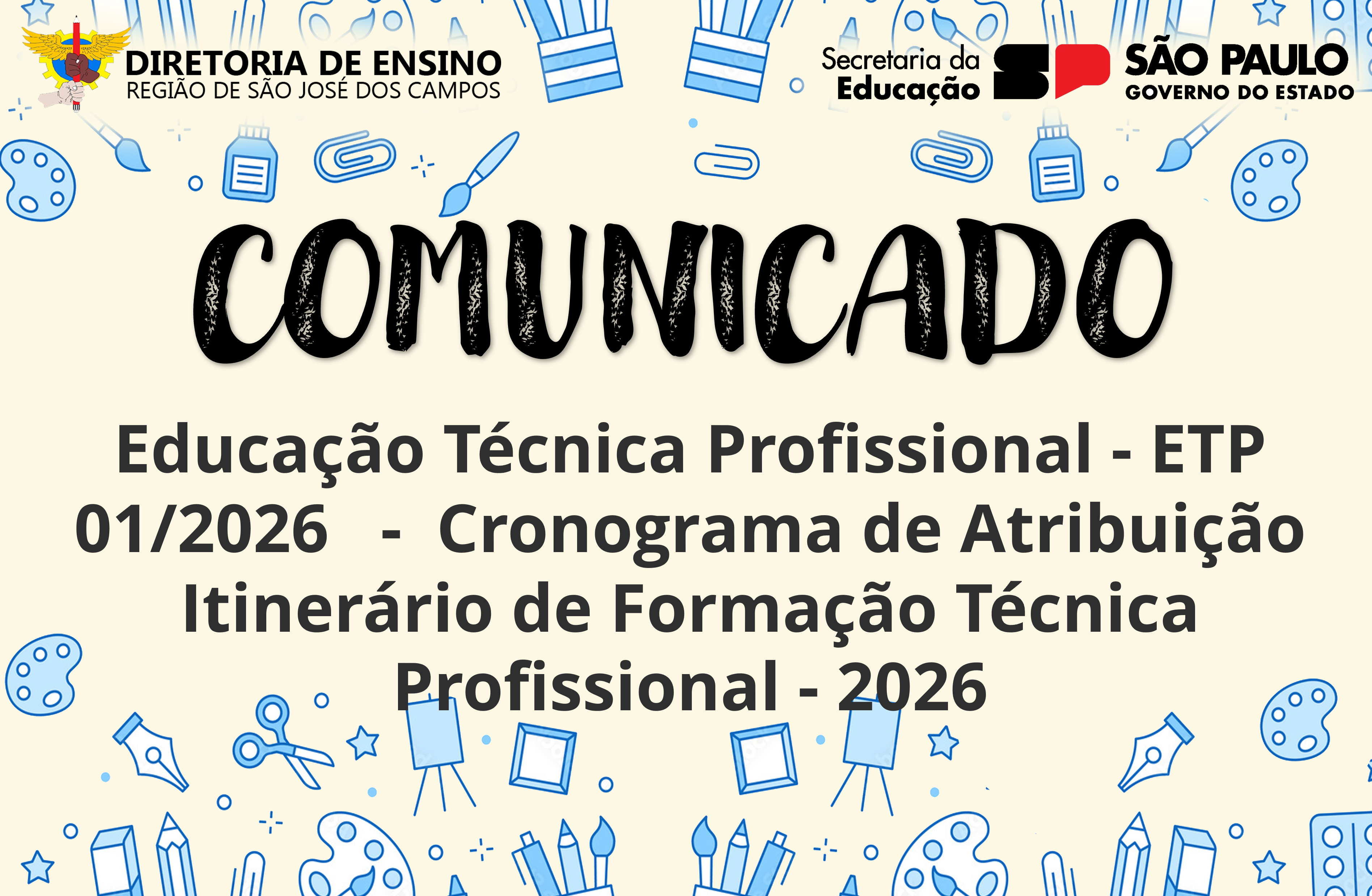 EDITAL DE DOCENTES PARA O CENTRO DE INOVAÇÃO DA EDUCAÇÃO BÁSICA PAULISTA (CIEBP) – UNIDADE … … Leia mais »EDITAL 001/2026 – EDITAL DE PROFESSOR ESPECIALISTA EM CURRÍCULO (PEC) Leia mais »EDITAL DE CREDENCIAMENTO – CENTRO SOCIOEDUCATIVO TAMOIOS – FUNDAÇÃO CASA (CI E CIP) – 2026 … Leia mais »EDITAIS DE CREDENCIAMENTO PEI – 2026 … Leia mais »EDITAL DE ATRIBUIÇÃO DE CLASSES E AULAS PARA ANO LETIVO DE 2026 … Leia mais »Comunicado Educação Técnica Profissional – ETP 01/2026 – Cronograma de Atribuição Itinerário de Formação Técnica … … Leia mais »