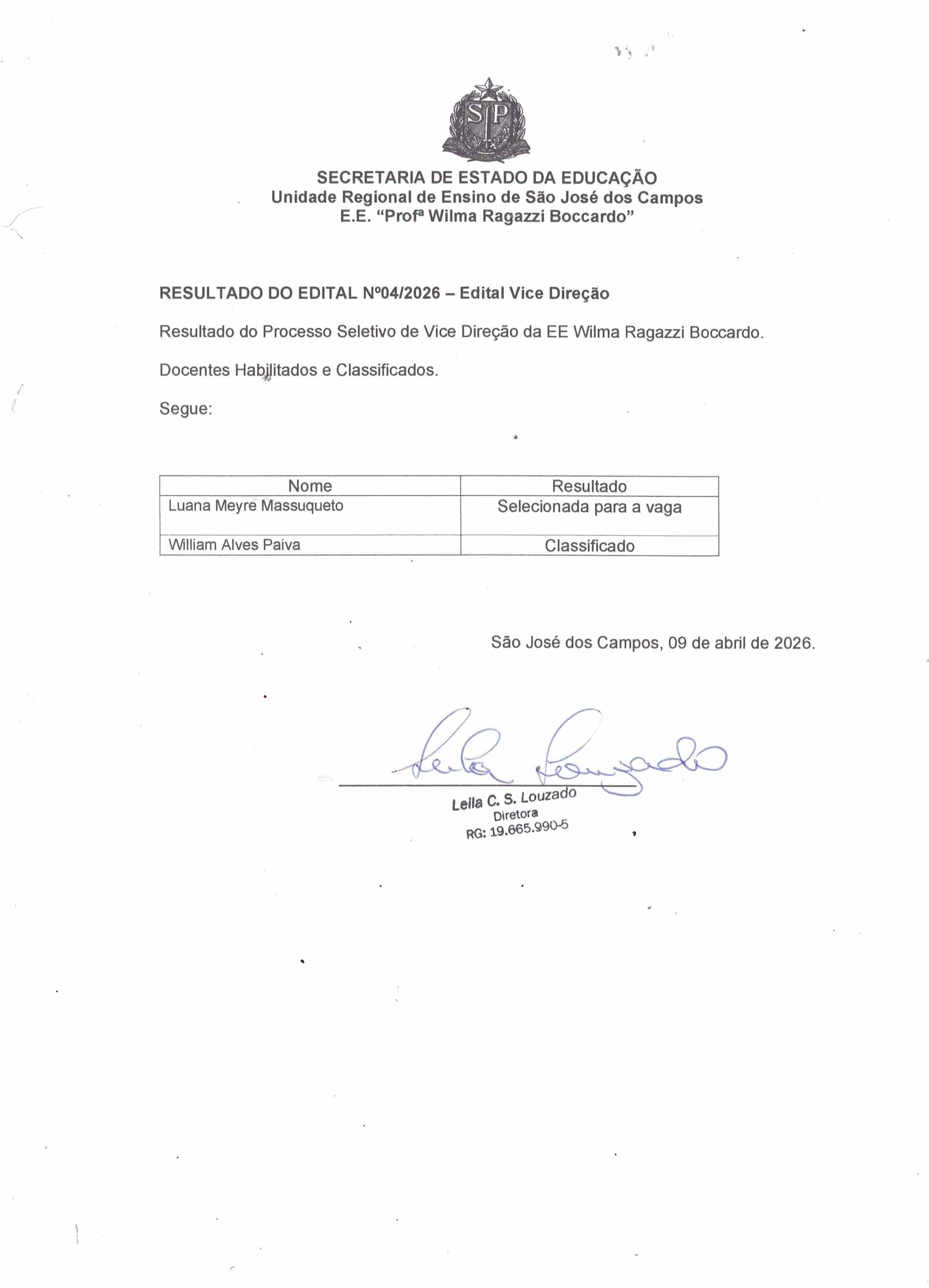 EDITAL PARA PREENCHIMENTO DE VAGA DE VICE-DIRETOR – EEWILMA RAGAZZI BOCCARDO 16-03-2610 de abril de 2026 Enviar por e-mail EDITAL PARA PREENCHIMENTO DE VAGA DE VICE-DIRETOR – EEWILMA RAGAZZI BOCCARDO Para acessar clique AQUI Para acessar o resultado clique AQUI LEIA TAMBÉM EDITAL – COORDENADOR DE GESTÃO PEDAGÓGICA – ANOS FINAIS – E.E. JOÃO CURSINO Edital de Credenciamento para Professor Coordenador do Centro de Inovação da Educação Básica Paulista — CIEBP, com sede na EE João Cursino Edital Sala de Leitura – EE Deputado Benedito Matarazzo Comunicado CAA nº 23/2026 – Atribuição de aulas Ordem Judicial